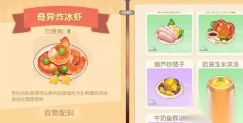 奇异炸冰虾配方攻略大全 摩尔庄园奇异炸冰虾怎么做 奇异炸冰虾配方:奇异果x1、冰川虾x1、冰川红虾x1、鳌虾x1、毛毛花x1。