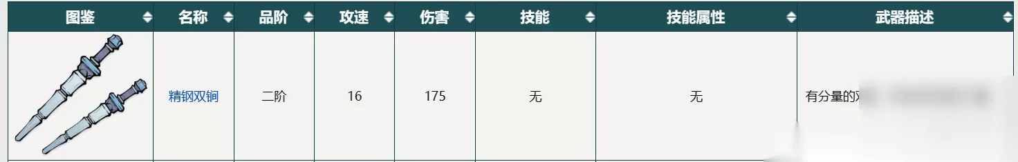 精钢双锏:这是一把二阶的锏类武器,攻速为24,伤害为144,技能为精钢飞锏,技能属性为金。这把锏的特点是可以向前方投掷两把锏,对敌人造成伤害和击飞效果,前期强力武器代表,二阶唯一带控制的武器,非常适合开荒。