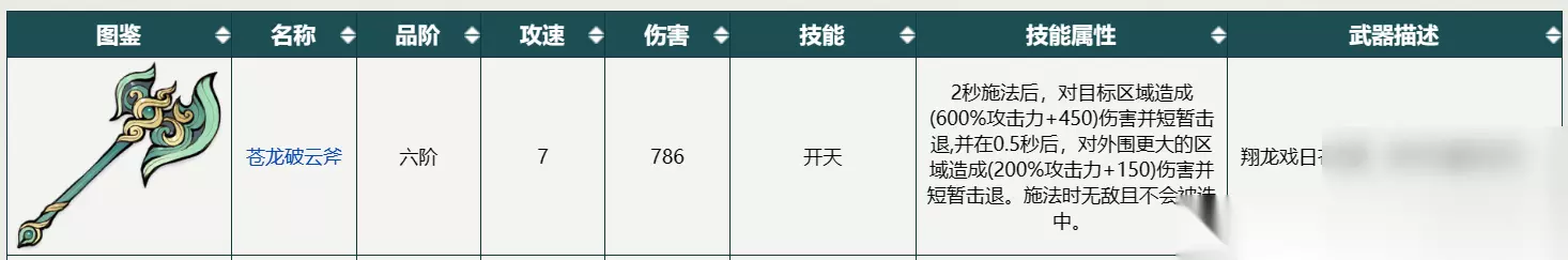 苍龙破云斧:这是一把六阶的斧类武器,攻速为16,伤害为240,技能为苍龙出海,技能属性为水。这把斧子的特点是可以释放一条巨大的水龙,对前方的敌人造成巨大的伤害和击退效果。这把斧子适合用于对付密集的敌群,或者需要远程攻击的情况。