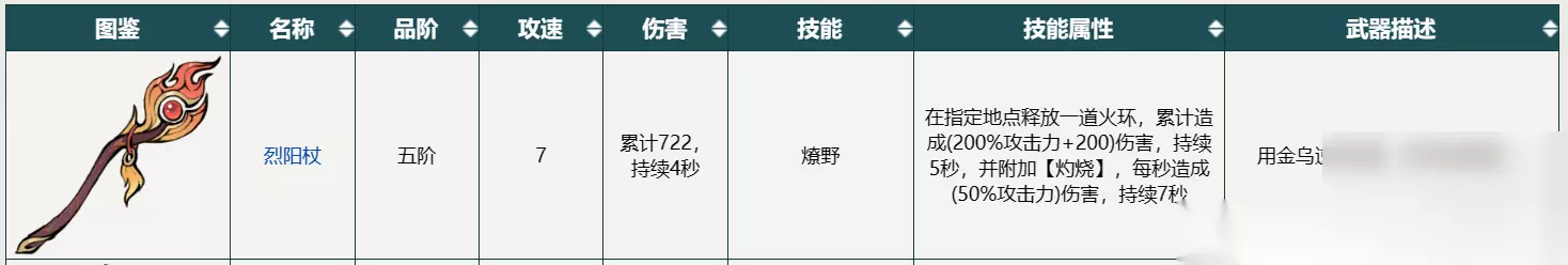 烈阳杖:这是一把五阶的杖类武器,攻速为20,伤害为196,技能为烈阳炎爆,技能属性为火。这把杖子的特点是可以在目标位置引爆一团火球,对周围的敌人造成持续的灼烧伤害和减速效果。非常适合放风筝,中期过度的时候大家可以带一把。