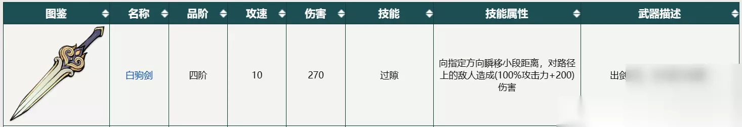 白驹剑:这是一把四阶的剑类武器,攻速为22,伤害为176,技能为白驹过隙,技能属性为风。这把剑的特点是可以在短时间内快速地向前冲刺,对沿途的敌人造成伤害和眩晕效果。