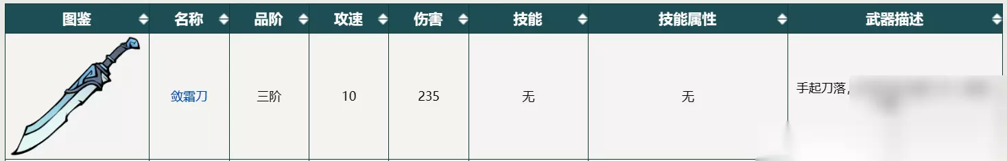 敛霜刀:这是一把三阶的刀类武器,攻速为18,伤害为180,技能为敛霜寒刃,技能属性为冰。这把刀的特点是可以在一定范围内释放冰霜之力,对敌人造成伤害和冻结效果。