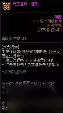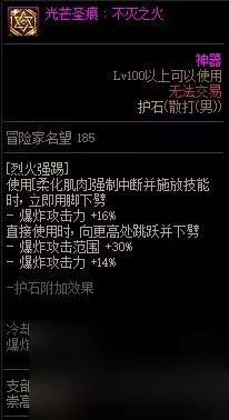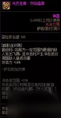 【护石提升率】柔化下伤害提升率35%,冷却时间减少10%柔化时直接使用时会直接下劈,无跳跃动作;不柔化时跳得更高且范围增加【护石解析】优点:高提升率并附带减cd效果,加上释放条件优化、范围增加,无论是爆发还是续航都是必带;佩带护石后可以直接用任意地面技能如下段踢来衔接落火,达到和此前旋风腿+落火一样甚至更快的爆发效果;续航上作为高阶技能有着仅次于护石下的炽焰旋风腿和闪电之舞的高秒伤,远远超越了其他中高阶技能,本身较长的基础冷却也使得其能和大量的cd装有着良好的相性。缺点:无。推荐指数:5星,必选,没有之一。