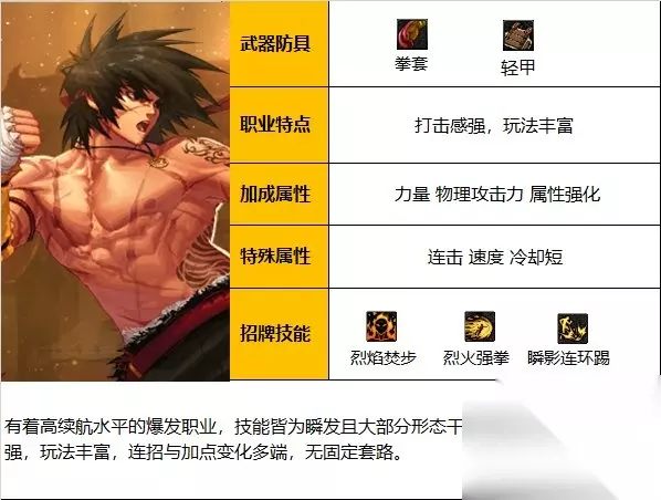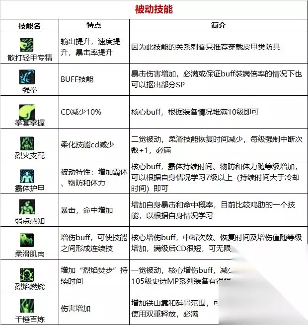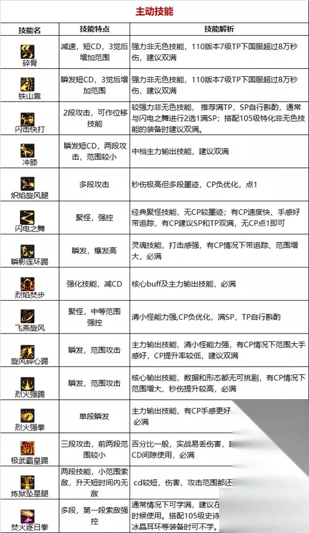 职业优劣势分析:【优点】有着较高续航水平的爆发职业,技能皆为瞬发且大部分干脆利落,玩法多样打击感强;一觉被动减少85%MP消耗,与黑龙手镯等耗蓝装备适配性较好;自带感电、中毒等异常触发能力(利用雷霆踏、毒瓶投掷等男格斗初始技能)。【缺点】技能范围小,部分技能y轴及背后判定不佳,实战容错低;无敌技能少(仅只有闪电之舞、二三觉等少数技能),作为近战职业生存环境差;当前版本数据低于全职业平均值。【大神点评】百分比近战职业,拳拳到肉,打击感超强。装备相性:流派选择:新号优先选择常规低血流,成型角色装备流派建议围绕自定义而定,例如有四词条恩特上衣情况下可选择攻速低血流,有四次条出血蓝灵上衣可选用攻速出血、石化出血流,考虑职业爆发快的特点,直伤流派刷图体验一般优于异常流派。武器选择:有异常词条自定义情况下优先选择邪龙拳套,理由之一是职业触发异常较为麻烦,二是制式拳套不加成一觉主动buff,对于武极来说邪龙拳套比制式拳套仅少2%伤害(其他职业一般在4%左右),无异常词条自定义情况下制式拳套和cp拳套均可。耳环选择:自定义耳环最优(3.5词条以上),无自定义耳环同时喜欢打桩的玩家可选择无色冰晶耳环,不喜欢小技能的玩家也可用隐匿之叹息耳环、吞噬风暴耳环(低血流)过渡。入坑建议:①针对搬砖刮痧(大天御玩家):由于职业生存能力较弱且容错低,低配刮痧模式下无较高熟练度会比较折磨,另外职业大范围清怪技能少且cd较长,不适合搬砖。②针对中配自强(巴卡妮回廊单刷玩家):中配自强玩家建议尽量拉满装备细节,同时多花时间打桩和刷图来提高“柔滑肌肉”的熟练度。③针对团本扛把子(红10甚至更高打造玩家):高打造玩家有条件可以准备一些特殊装备结合职业特点提高游戏乐趣,例如用cd称号压缩二档cd,缩短爆发间隔;佩戴控制异常三槽对无韧性条或者破韧后的怪物实现快速斩杀(需组大奶及破韧兵)。总结:武极当前版本定位比较尴尬,作为爆发职业由于数据较低(男格斗垫底,全职业中下),中低配玩家难以体会秒杀副本的快感,作为续航职业由于无敌技能少、中低阶技能范围小,刮痧模式输出环境堪忧,总而言之当前仅推荐高打造真爱玩家入坑。 技能加点和护石 1.常见玩法心得 上buff(强拳、霸体、一觉),吃药剂,可提前开二档(双重释放),时间充足情况下可先对着怪物上下跑,利用烈焰焚步的地火攻击力触发异常、连击增伤词条,然后再释放技能。 1.先释放小技能和多段技能(方便触发异常、连击增伤词条)然后大技能,例如闪击快打(锁定敌人身位)-碎骨、铁山、冲膝-碎心、飞燕、落火、火拳、95、大脚等。 2.带大脚护石情况下学习“强袭重击”,可在大脚击中怪物时按z键强行中断,以便衔接后续技能。 3.男格斗主动技能“蹲伏”(一级精通)在点sp和tp情况下,可以获得0.2-0.6s无敌(视tp等级而定),另外闪电之舞、后撤步、二三觉也有短暂无敌,合理利用无敌技能可在军团/团本中躲避秒杀机制。 4.完成偷学任务可学毒瓶投掷、雷霆踏帮助触发中毒、感电异常,男格斗通用技能念气波也可触发感电。 5.带落火护石情况下,建议不用旋风腿、炽烟旋风腿做为前置技能,落火会因此被判定成空中下劈释放少2%伤害。6.技能释放过程中开二档有丢伤害的bug,谨慎使用。 2.加点 110版本常规加点,侧重大技能爆发,兼顾非无色技能续航。拳套精通、强拳、霸体护甲、物理暴击、弱点感知和闪电之舞的SP等级可根据需要灵活取舍 带闪电之舞护石建议SP,TP双满
