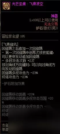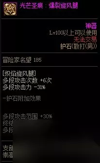 【护石提升率】伤害提升率31.4%回旋踢之后再次按技能键可追加一次回旋踢,按对角线方向键时, 可以向对角线方向发动回旋踢,多段攻击次数、移动距离、范围增加。【护石解析】缺点:无论对于爆发还是续航,提升都是乏善可陈,虽然范围增大但是打满伤害需要按技能键两次,对连招的流畅性造成影响并增加了操作量,,佩戴后技能形态和手感都是负优化。优点:方便清小怪。推荐指数:3星,仅限过渡使用。