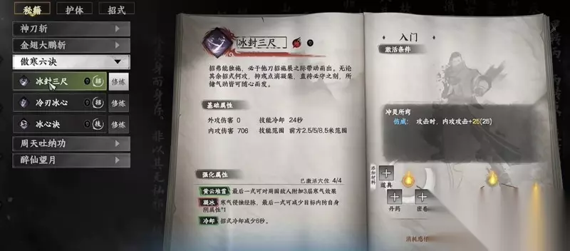 冰封三尺作为基础招式,需要配合其他技能使用。虽然外攻伤害为零,但能在2.5-8.5米范围内造成706点内功伤害。其强化效果"黄云堆雪"能在最后一击时给周围敌人附加三层寒气,"凝冰"则可以降低目标的阴属性防御,配合冷却时间缩减,让这个技能在战斗中能频繁使用。