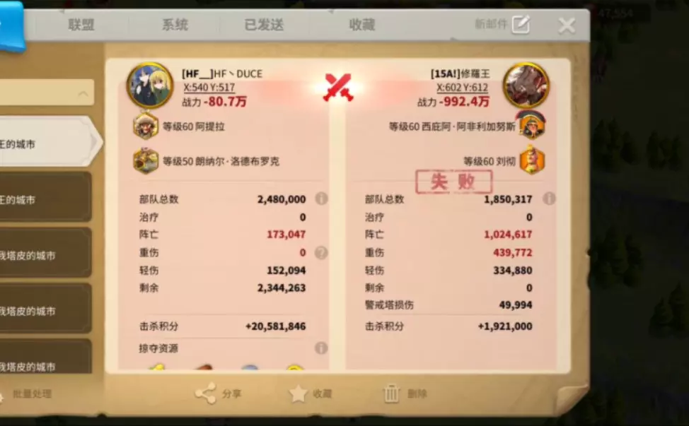 这是《万国觉醒》315区的对战攻略内容,展示了HF联盟发现敌方玩家后,趁其部队距城堡有8分钟路程时发起进攻,最终击败对手,使其战力大幅下降的对战过程。