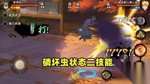 一技能主要的作用就是切换形态,但同时也有一个蓄力攻击的效果。首次释放会让油女取根进入到磷坏虫形态,在这个形态下再次释放一技能会有一个磷坏虫·散的攻击效果。这两个攻击效果其实区别不大,你可以简单理解为就是暴怒带土一技能释放第一段的效果,只是没有了那个释放瞬间的虚化无敌。而在磷坏虫状态下长按一技能会有一个蓄力的攻击效果,攻击的范围和伤害也会相应地提升。