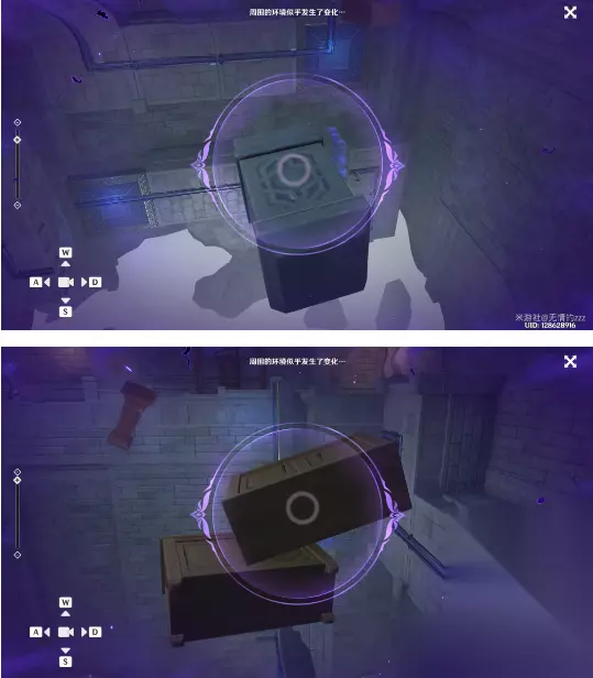 4、随后我们继续向前进,在我们行进的路程中,将会在周围遇到一个宝箱; 5、我们将会来到下一个地点,同样也是先旋转机关,后校对,要是不知道转几下的小伙伴,可以根据鸦眼机关来;