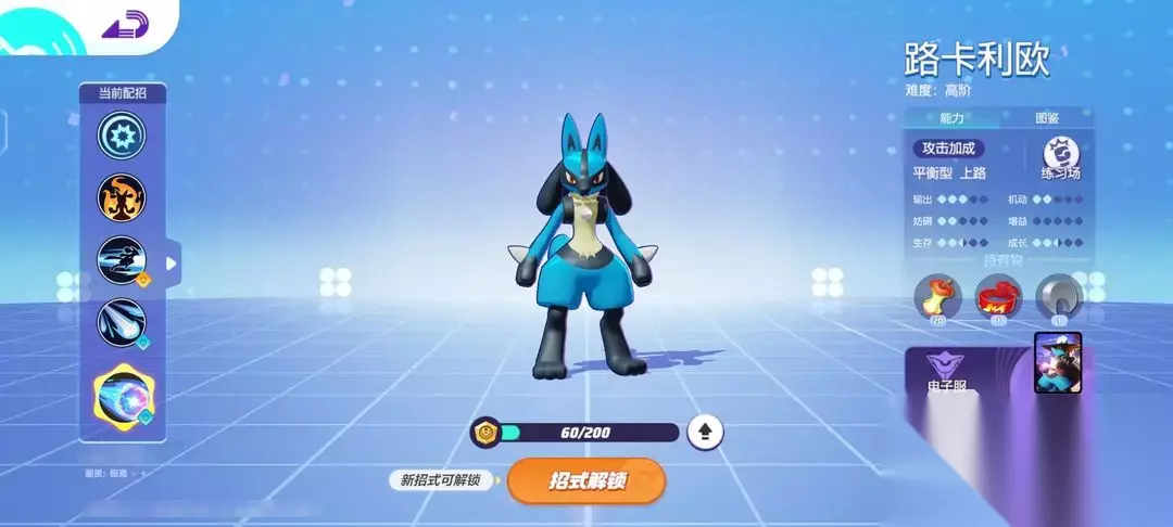 图鉴三:路卡利欧 波导勇者路卡利欧是一只平衡型的宝可梦,不论是生存能力,还是输出能力都非常的在线,是一个操作上限很高的角色。他的特性可以进一步提高该宝可梦的容错下。学习神速后普攻三下为强化普攻并为目标挂上神速标记。神速核心机制在攻击到神速标记的敌人时,可以刷新神速的冷却,最好是保持一直攻击有目标的敌人,这样保证神速不中断,可以选择附带叠加伤害的分支技能。 比如“骨棒乱打”,可以控制对手并挂上标记。集结招式主要是用来抢夺资源,或者进行远距离的击杀,可以弥补自身技能的空档期,而分支技能的选择主要就是用来提升实质性造成的伤害的。