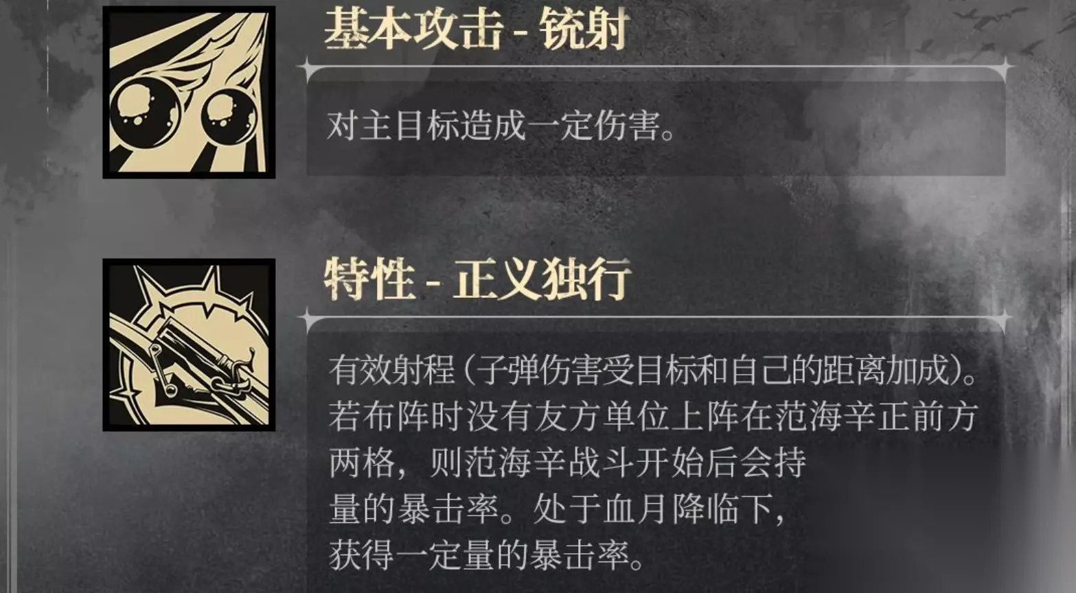 buff最多可叠到五层并提升10%的攻速,每三秒会损失一层。奥义技能改变平A形态,并对敌怪周边3.5米范围造成溅射。溅射会打出180%攻击的物伤,击败敌方时能额外得到一层追猎。至于它的特性为“正义独行”,其1能在敌方越远的时候打出的伤害越高。2可在正前方两格没有友方上阵的时候,每隔二十秒提升自身的暴击。3可于血月状态下,增加10%的暴击。