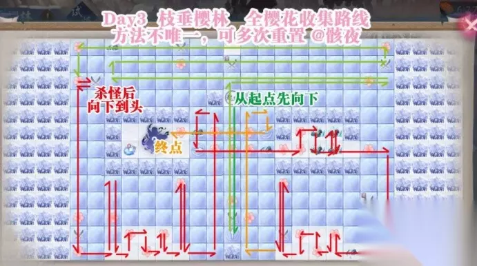 注意事项:路线中未经过小怪根据提示选择是否需要打,否则直接右上角关闭即可。 路线图主要针对较难完成的成就,未涉及到的成就,可以通过重置樱林刷次数完成。 阴阳师枝垂樱林樱花和宝箱路线 DAY3枝垂樱林,全樱花/宝箱收集路线图,方法不唯一! 活动界面右下角-试炼-成就-寻樱者,旁边的小感叹号,可查看自己每片区域的樱花收集度。 有花的格子先击杀边上的怪或者拿到秘宝后前进 5个樱林的活动任务其实都大差不差,但是樱林的地图差别还是挺大的,每一张地图都有不同的玩法,给玩家们带来一些有趣又有难度的挑战。美术组的设计还是挺有意思的,没有进行挑战的樱花树是绿色的,挑战成功之后就变成了粉色的樱花树,让那个玩家来手动开启樱花季节,在游戏中感受一下春天的气息,三次元中的樱花应该也开了。