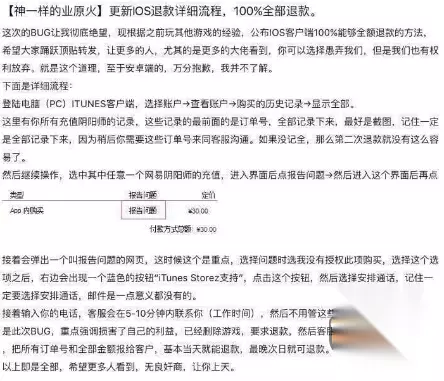另外一种方式: 1.iTunes首次退款的门槛是很低的,如果各位是第一次申请退款,一般都是会通过的。每隔一段时间苹果可能会重新评估信用。 2.频繁退款会被苹果列入信用黑名单,请谨慎考虑。 3.一般来说,苹果非常注重用户隐私。所以退款账号的详细信息苹果是不会透露给运营商的。即网易不知道到底是哪些玩家退款了,所以封号什么的不用太过担心(如果WY有其他手段获取这些退款名单的话那我就不保证了。) 4.申请退款毕竟是有点败人品的行为。各位如果真的对产品很失望,那可以坦坦荡荡地去申请。(WY不要脸我也不要脸啦啦啦) 如转载涉及版权等问题,请作者与我司联系,我司将在第一时间删除或支付稿酬。
