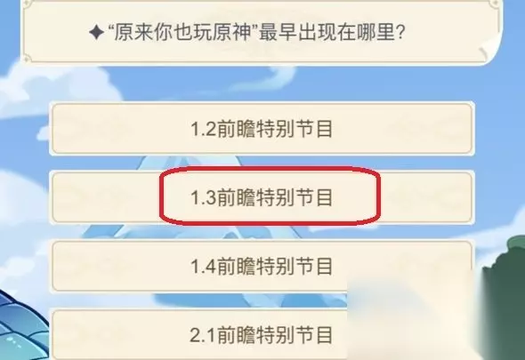 答案:1.3前瞻特别直播 解析: 1、【原来你也玩原神】这句话是官方的广告语,广告抓住这一点引发玩家共鸣,就成了一个梗。 2、不过不得不说原神这款游戏吸引了大量的玩家,遇到也在玩原神的玩家时,就会有人感叹原来你也玩原神。 活动介绍 活动时间:2021年9月27日12:00-2021年10月7日23:59 活动内容: 活动期间,回答H5内问题并分享得分即可获得相应原石兑换码(限量300万份)。 获得兑换码后,旅行者可前往游戏内「设置」-「账户」-「兑换码」领取礼包。 活动奖励:30原石(限量300万份) 以上就是小编整理的关于《原神》周年20问答案汇总的全部内容,更多游戏攻略请持续关注233乐园游戏网!