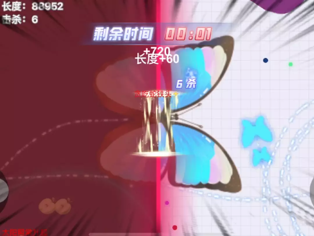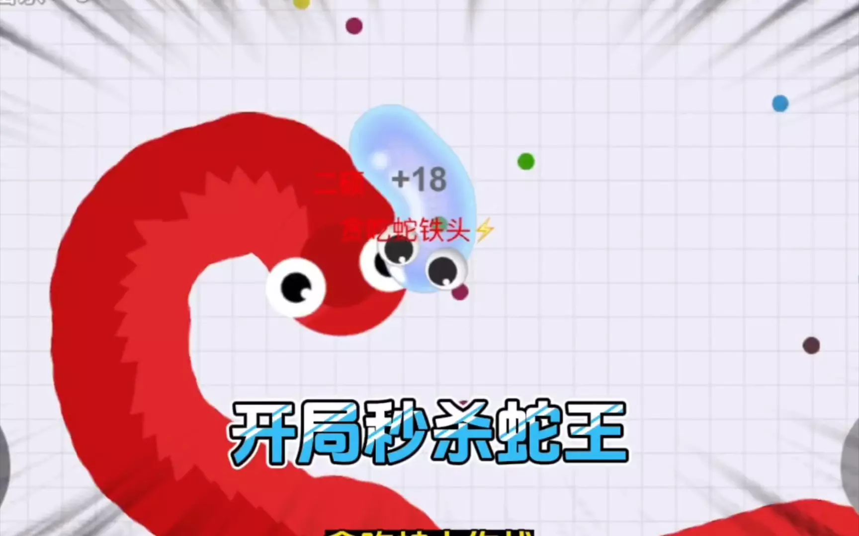 这是《贪吃蛇大作战》的游戏内容,展示了玩家操控的贪吃蛇挑战三秒干掉蛇王的过程,过程中玩家操控的贪吃蛇完成击杀,排名得到上升,还能看到霸屏进度的相关数据。