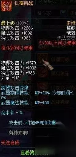 【T2线武器】 top13 [纵横百战] 简单粗暴45%普通白字,但是别忘了看面板,比一般的90史诗还要高30%的物理攻击力和独立,别小看了这30%,这可是基础面板,提升可远远不止普通加攻击力的30%,而且多的那300+独立相当于白送你一个锻造7