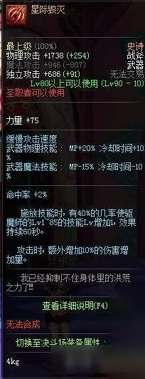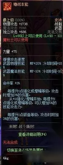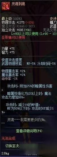 top1 [灵魂剥离] 90级最强副作用与最强伤害并存的最强武器,25%暗白,16%魔攻,作为一个四叔你连120暗强都堆不到,我推荐你换个职业吧,什么?你又要和我说荒古?不开魔能不升级的荒古,和辣鸡有什么区别?荒古升了级还开了魔能?辣鸡升级不还是辣鸡吗? 这武器那都好,就是不吃药只能战斗15秒,15秒内不是你死就是我亡,这才是90级史诗该有的王者风范!