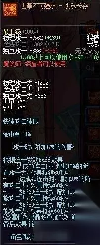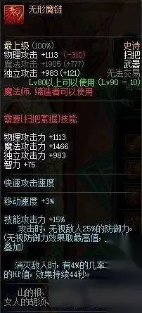 top12 [无形魔链] 一把直接不要鬼泣的武器,还有15%技能攻击,魔道的技能攻击力可能加成不大,但是你别忘了滑稽树,滑稽树+15%的固伤那是何等恐怖?而且这武器的独立和魔攻也是高出其他武器30%,副作用基本可以无视,缔造带的话可以再带个瞎子和暗帝,鬼泣彻底失业