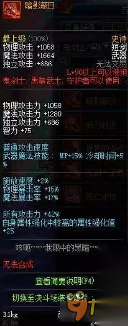 top15 [暗影弊日] 42%所有攻击,25点属强,所有攻击这属性是最强的属性,也就是超级黄字,你的光白爆越高,所有攻击加成越大,而且不冲突加算,42%所功是所有装备里最高的了