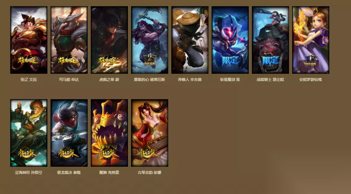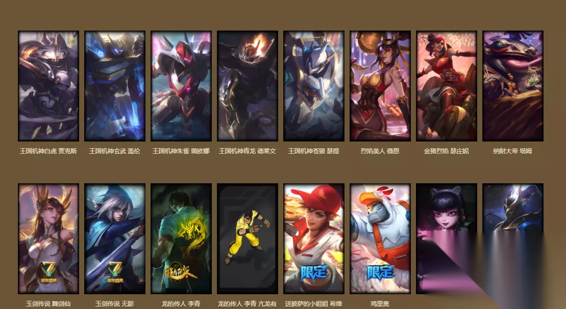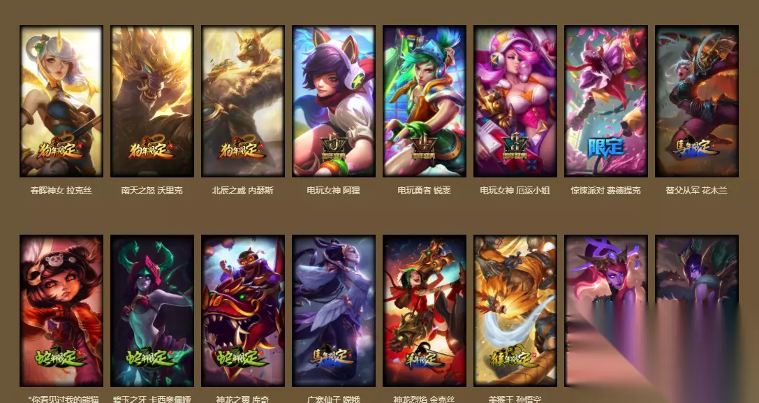 3.周年庆典以及其他限定皮肤 英雄联盟每过一年便会推出一次庆典活动,这时会推出相关皮肤,我们可以做活动免费领取。但是时间过了就无法获得,这次在福袋里开放了一到七周年的限定皮肤,都是特别稀有的,获取后能够证明你是老玩家。此外,还有其他限定皮肤,例如哥特萝莉、崭星系列皮肤以及龙瞎等。
