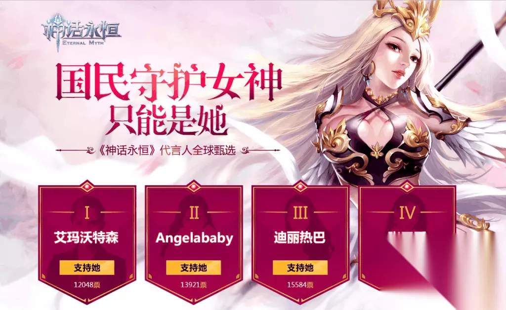 四位符合游戏守护女神定位的中外人气大牌明星——艾玛沃特森、 Angelababy、迪丽热巴和张天爱,在玩家的推动下热烈角逐,经过近一周的人气厮杀,迪丽热巴凭借其温润如玉的古典气质、唯美灵秀的高雅形象和万夫莫当的超高人气,力压群芳,最终获得玩家心目中“国民守护女神”之位,以21104票高居榜首,成为玩家在魔幻世界中最愿共同游历的守护女神人选。