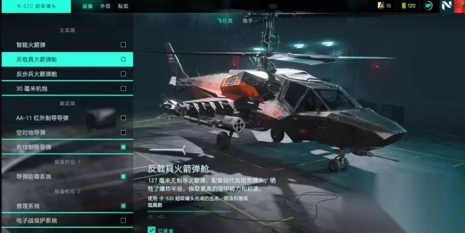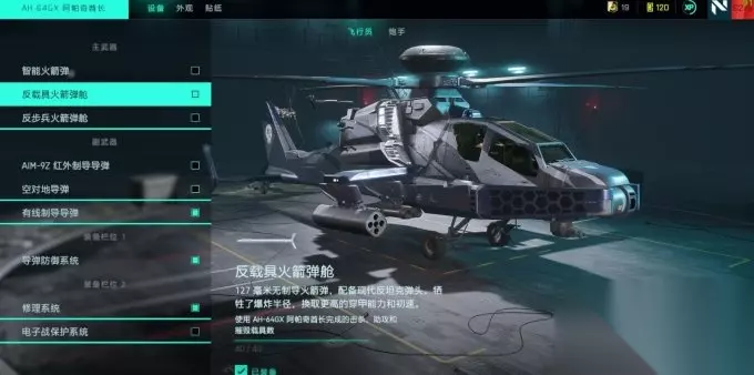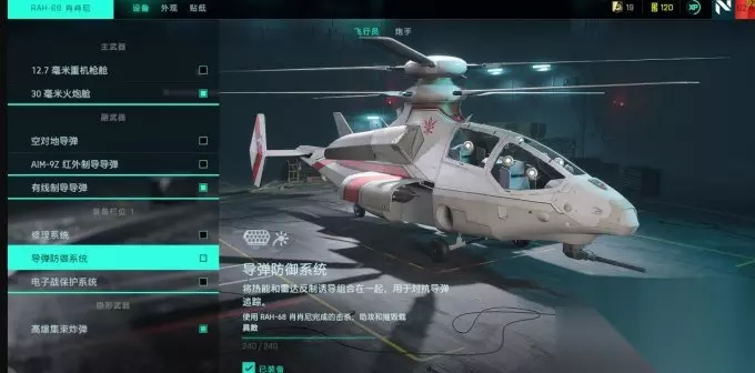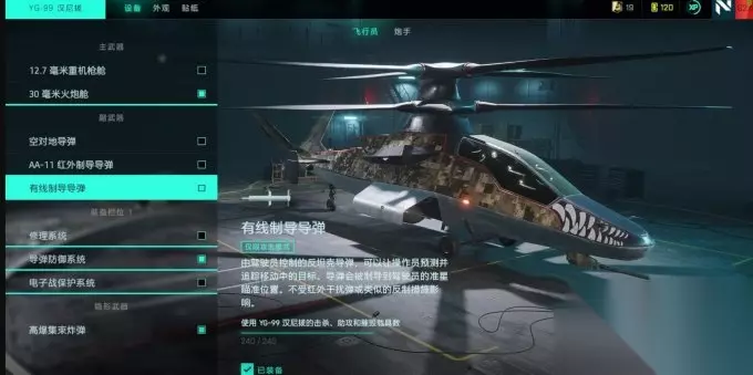 因为武直的加强,以及隐直的削弱,其对地载的威胁要弱于武直。不过由于本身可以进入隐身模式的特性,也有一定的可玩之处。 配备介绍: 12.7重机枪:对付敌方空载的主要武器,伤害可观。对付步兵表现一般。 30mm火炮:主要用来补充对地载的伤害和反步兵。 AA、AT导弹:对空和对地锁定发射的导弹。 有线制导导弹:无需锁定直接发射,发射后可手动操控导弹飞行轨迹。 隐直的快修和热诱弹不能同时携带,只推荐带热诱弹。主要流派还是30mm机炮加空对地或者有线制导导弹。按Z进入隐身模式,此时主武器变为4枚高爆集束炸弹,对地载步兵的伤害都十分可观。隐直的二号位还可以发射电磁干扰弹,可以辅助主驾驶对付敌方载具。 4.固定翼