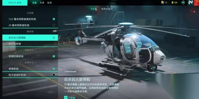 机动性最强的直升机,pro哥手中的小鸟十分恐怖。空载和步兵都深受其扰。 配备介绍: 7.62双联机枪:射速快,是对付步兵和空载的主要武器。 20mm机炮:几经削弱,伤害一般,可对重型载具造成伤害。 反步兵火箭弹:削弱多次,目前表现一般。 空对地导弹:锁定后对地载发射的导弹。 推荐搭配: 机枪+反步兵火箭弹,特化对步兵作战的机枪鸟,配合小鸟的机动性,可在战场灵活作战。专打步兵。 机炮+空对地导弹:特化对地载作战的机炮鸟,击杀步兵效率一般。 注意:和武直一样,在极近距离机枪扫射时,子弹落点不在屏幕中心,可用机枪的过热圈瞄准。 3.隐直