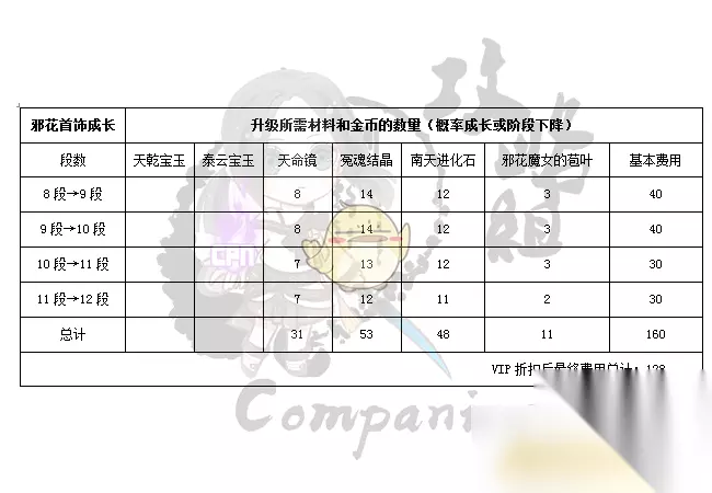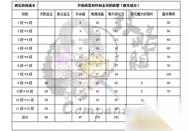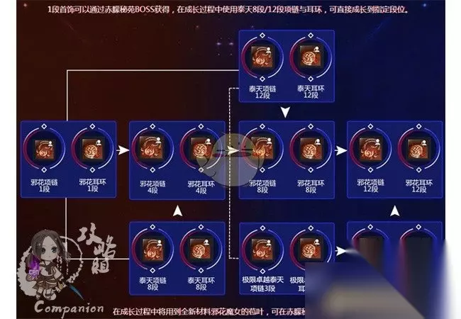 二,邪花首饰成长所需材料及金币 目前,邪花首饰有 邪花项链 和 邪花耳环 ,两种首饰成长所使用的材料和金币数量是一样的。玩家可根据需求和自身能力范围内选择提升自己的邪花首饰段数,以提高游戏角色的能力值、属性或武功加成。 1,邪花首饰1段 + 泰天首饰8段 + 天命镜x10 升至 邪花首饰4段; 2,邪花首饰1段 + 泰天首饰12段 + 天命镜x20 升至 邪花首饰8段; 3,邪花首饰1段 + 极限卓越泰天首饰3段 + 天命镜x90升至 邪花首饰10段; 4,邪花首饰1段 升至 邪花首饰12段; 5,邪花首饰12段 升至 极限卓越邪花首饰3段。