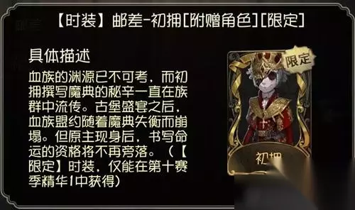 邮差初拥皮肤图文展示 血族的渊源已不可考,而初拥撰写魔典的秘辛一直在族群中流传。古堡盛宴之后,血族盟约随着魔典失衡而崩塌。但原主现身后,书写命运的资格将不再旁落。