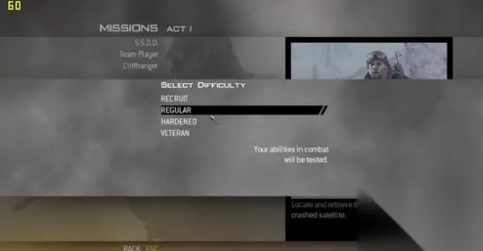 和之前的几代一样,《使命召唤6》也可以随意选择之前玩过的关卡重新游戏,并且难度也是分为RECRUIT、REGULAR、HARDENED、VETERAN,为了避免一出来就被不知道从哪里飞来的手雷炸死,所以我还是保守的选择了REGULAR难度。
