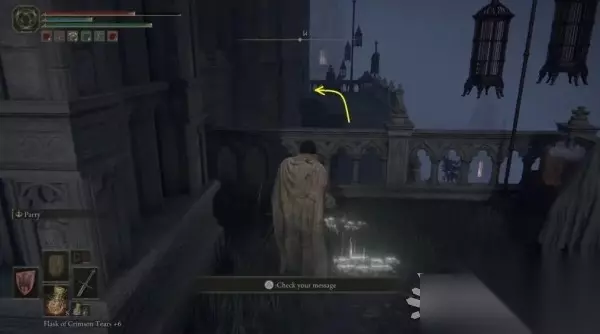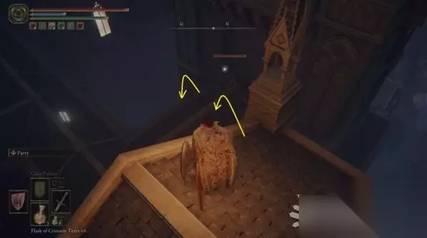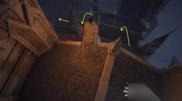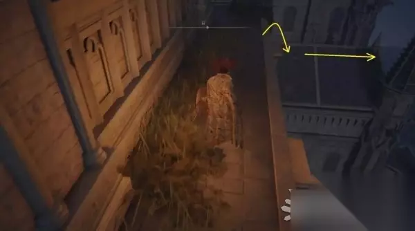 从屋顶边缘跳下,来到下方的屋顶,左拐后继续往下跳。