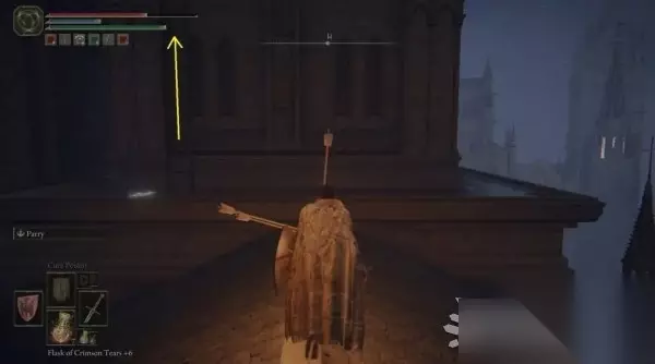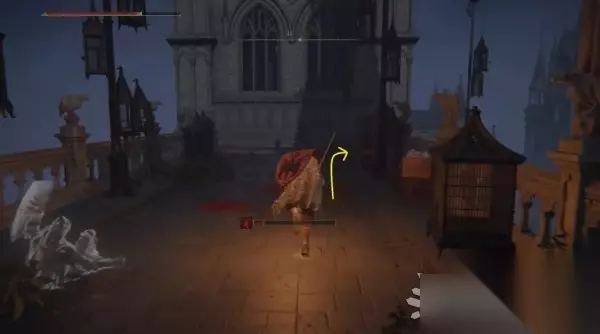 从下图所示的屋顶跳下去,靠右继续往下跳。