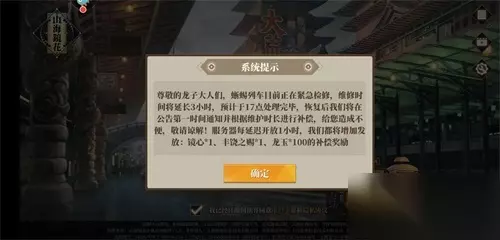 2)停服维护追加奖励: 服务器出现异常后,超过1小时无法登陆,每延迟1小时,增加发放镜心*1、丰饶之赐*1、龙玉*100; 称号将于活动结束后统一发放,期间维护补偿奖励将在维护结束后第一时间发放