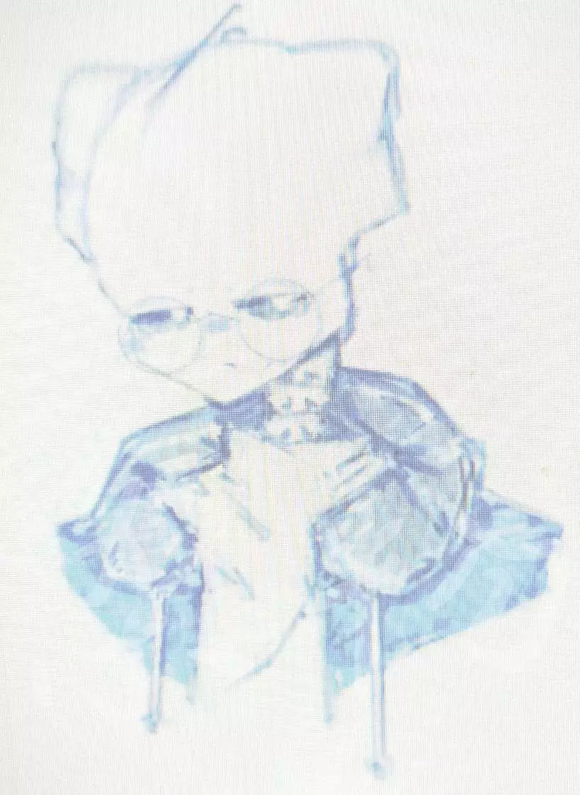 然后就会有一个拿着红色物体的小孩形状去砍一个穿着蓝色连帽衫的形状