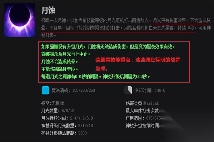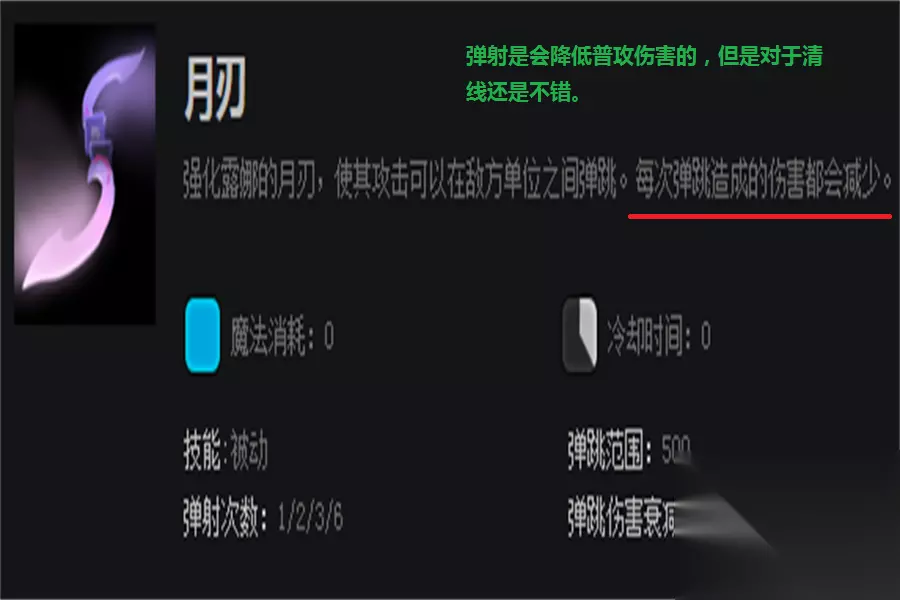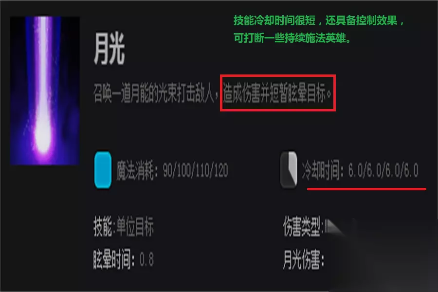 1技能,露娜前期主要的输出技能,可对敌方英雄造成短暂的眩晕效果,有时候配合队友进行留人也不错,技能冷却比较短,在有蓝的前提下,我们可以频繁用此技能来打消耗。推荐主升。