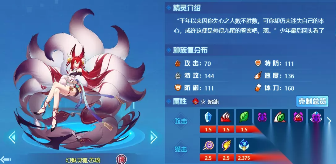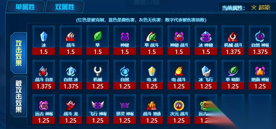 三、精灵属性【火/超能系】 克制面:只要是和超能系沾边的属性,都不会太烂。虽说双属性超能系在打击面上确实不咋地,但这个属性同混龙属性一样,都是适配巅峰的一个属性。我不能在属性上占多少优势,对手也同样不能。2倍以上的克制一个都没有,主流都是1.5~1.25倍克制,说实话是火系的问题。