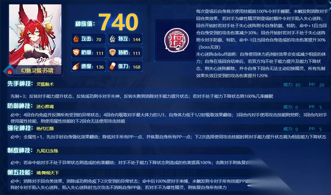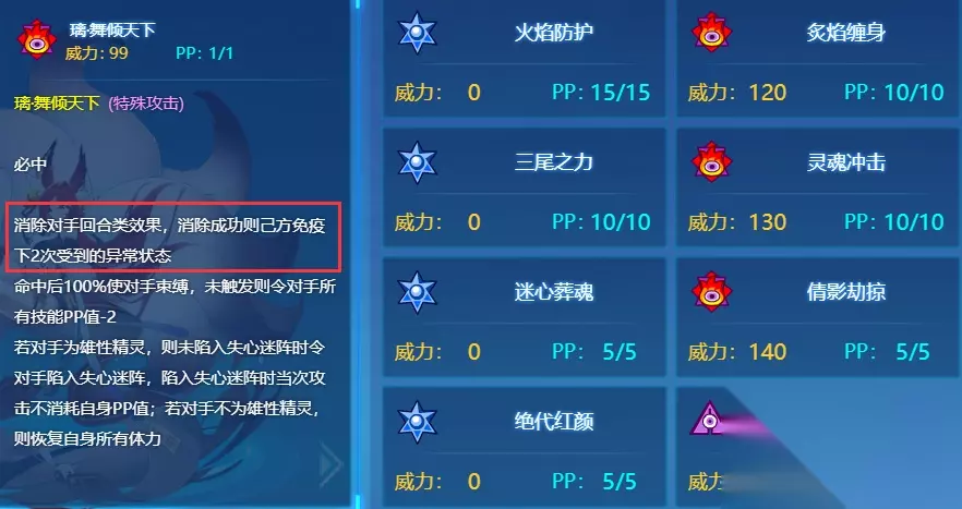 璃·舞倾天下:必中;消除对手回合类效果,消除成功则免疫下2次受到的异常状态;命中后100%使对手束缚,未触发则令对手所有技能PP值-2;若对手为雄性精灵,则未陷入失心迷阵时令对手陷入失心迷阵,陷入失心迷阵时当次攻击不消耗PP值,若对手未雄性精灵,则恢复全部体力。