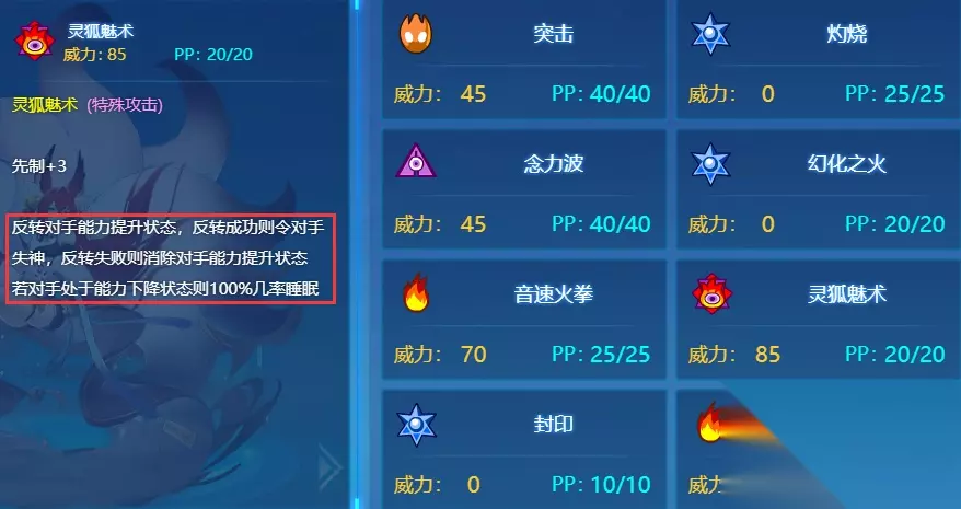 九尾幻念殇:若命中前对手不处于异常状态则造成的伤害翻倍;对手不处于能力下降状态则造成的伤害提高100%;击败对手则恢复自身全部体力和所有技能PP值; 最受争议的核心技能,对手白板状态、不弱化状态威力翻倍,在原有的基础上,150的威力被翻了2倍,也就是150+150+150=450,击败有补偿,可以跳佛,而且这是一个超能系本攻。