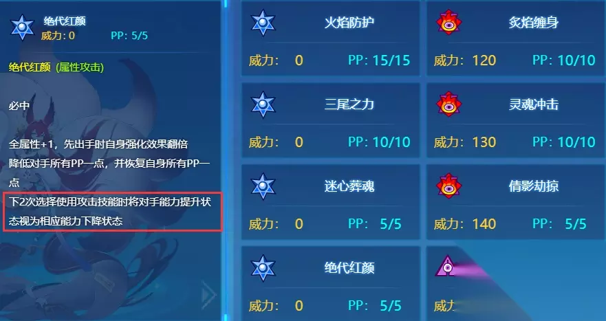绝代红颜:强化、削PP补偿PP,无视对手强化效果,属性技能没有先制也是醉了,所以别听有的玩家吹,吹再强你拿到手里感觉一般,那就是真的一般。但这精灵总体定位是在一线,所以购买还是值得的。