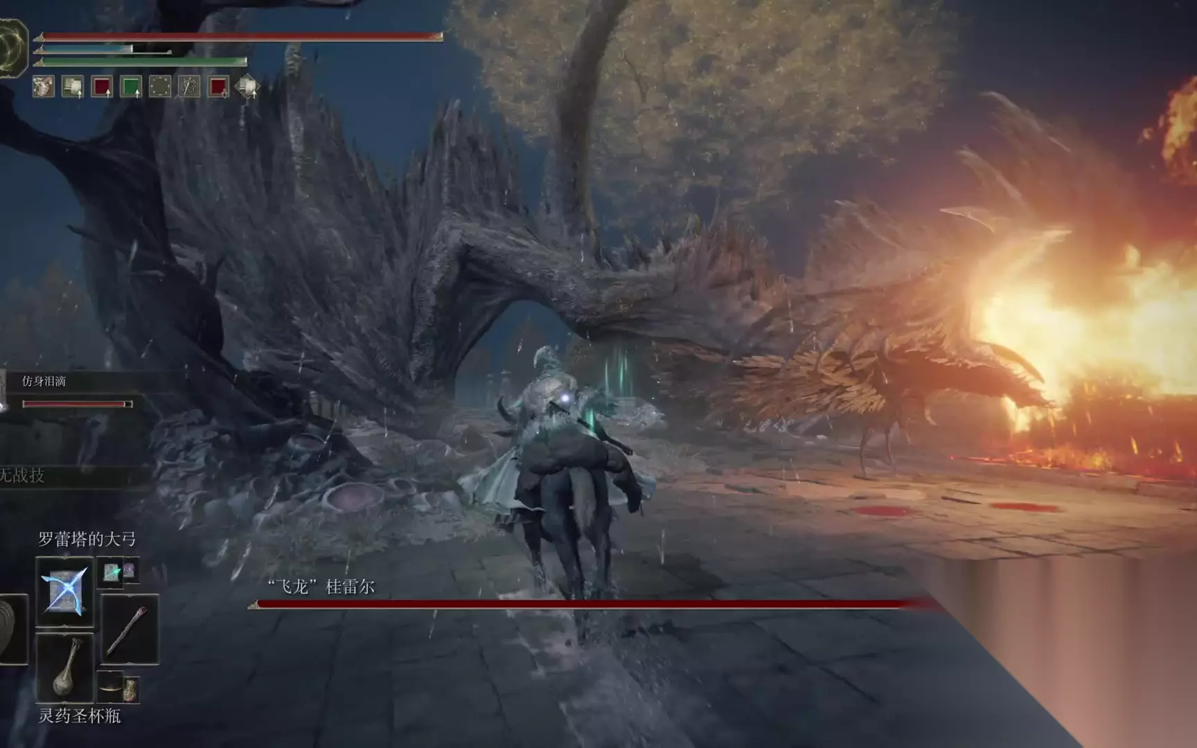 在这里近战也无法打到boss,所以需要骑着灵马使用岩石术来攻击BOSS。之后的流程就是站桩使用岩石术攻击,蓝用完了磕蓝药回复即可。飞龙桂雷尔的弱点在于它会离开大桥,一旦离开就会脱战并满血刷新回桥上。因此需要不断寻找机会进行输出,同时注意躲避它的攻击。最终击败飞龙桂雷尔之后,可以拿到它掉落的八万卢恩以及一个龙心脏。