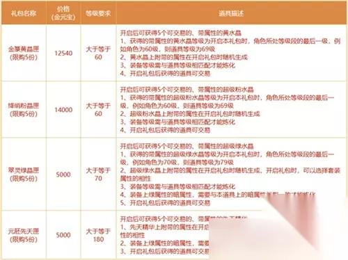 玩家可使用金元宝购买神工匣,开启后可获得指定装备部位的带属性黄水晶、超级粉水晶等炼化道具。每种神工匣限购5次,开出的道具均为可交易类型,可与其他玩家交换所需装备部位的属性。每个礼包使用时都需指定装备部位,指定后即可获得5颗指定部位的带属性的装备炼化道具,获得的属性为随机产出;道具等级为玩家在开启礼包时,所处等级段的最后一个等级(若玩家转生,则按180级计算)。