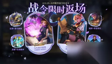 11.15日S19赛季、S25赛季战令皮肤正式返场,返场的4款战令皮肤分别是S19刘邦-夺宝奇兵,阿轲-迷踪丽影,S25后羿-圣弓游侠,干将莫邪-真爱魔法。