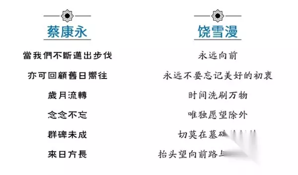 同样,译本中写道“此路或有蹉跎君莫忘,必有靈犀相佐” 也能在康永哥的成长经历中找到影子。在洛杉矶读电影专业研究生得到过导演胡金铨的推荐,进入电视行业,是因为制片人张小燕的慧眼识人…… “我輩念茲在茲,願君終有所成,一旦再相逢 必是人間殊勝”