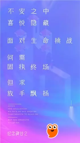 那今天我们就来聊聊康永哥的译本吧; 玩过《纪念碑谷2》的朋友都知道,游戏主要讲的是母亲与女儿在充满几何奥秘的纪念碑谷世界中探索,是一个关于成长的故事。在《纪念碑谷2》原版文案中,无论是英文抑或是中文均指向了对成长的讨论,而且文案有个明显的特点——“留白”。用最少的文字作为游戏的“点睛之笔”。对于译本创作者而言,有非常大的操作空间。 我们先来看一段康永哥和饶雪漫对同一处原文的翻译: