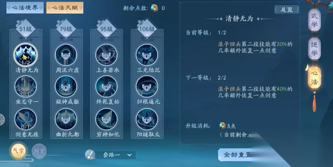剑宗的核心心法围绕萧史乘龙和古柏森森展开,前者能重置技能冷却并回满剑意,后者则是高爆发的多段伤害技能。心法加点需优先提升剑意恢复效率,确保关键技能循环流畅。51级阶段推荐清静无为与坐忘守一,75级选择周流六虚增强爆发,94级终干复始进一步强化终结能力。剑宗需注意技能释放节奏,避免剑意耗尽导致输出断层。