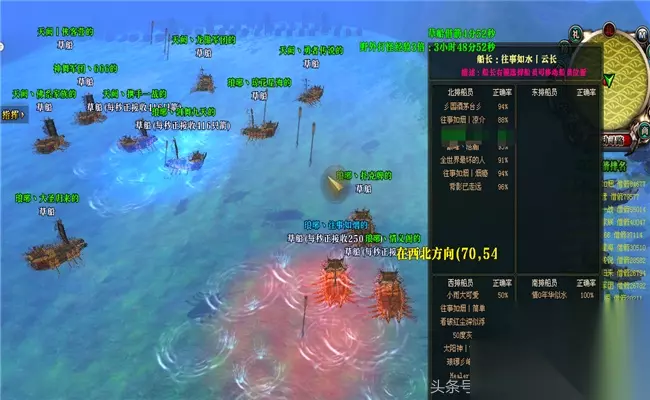 船员进行草船借箭的时候,要认真看着自己在哪方向,东南西北四个方向,船长发出指令,船员屏幕中间会出现,南A或者D,北A或者D,还有东和西,比如说你在南,屏幕上有南D,你就按D就行,没有你的就别按,而且一定一定要确保按正确,如果按错误,那么就会拖累船的移动速度。 【草船借箭排名】 12个家族会分为一组,同时进到草船借箭地图里面,互相竞争,右下面会有草船借箭排名,哪个家族的箭数多,就会排名靠前。 船长越给力,家族成员越配合,那么就会排名靠前,慢慢领跑,如果能够坚持到最后就可以获得最丰厚的奖励。 若能赢取草船借箭活动之一名,那么可以获得6800两的家族资金,获得200两绑银,1300点家族功勋,4136160点经验。 【草船借箭注意事项】 家族参加的人员越多,协同操作越好,船只行驶越快。 船长可以对船员所在的位置进行调整。 一个颜 *** 域内的船只共同平均分享此区域的箭枝。 蓝 *** 域虽然最多,但最后去的人也多。所以看情况去红区域也是个不错的选择,这就要看船长的判断力和经验了。 【草船借箭小技巧】 如果家族人执行力非常高,那么可以卡一下草船借箭活动,也就是说20.05的时候所有人不要进去草船借箭的地图,等到20.06分,船长在先进去,这样就能避开比较活跃家族们的分组。 草船借箭地图左边与右边,基本都会刷新蓝 *** 域或者红 *** 域,所以船长可以来回在这两边行驶,以获得更多的箭数。 通过对《御龙在天》中草船借箭玩法的教学了解,我们可以看到,游戏为玩家提供了丰富多样的游戏体验。参与草船借箭活动,不仅可以锻炼玩家的智慧和策略,还能获得丰厚的奖励。希望每一位玩家都能在《御龙在天》的冒险旅程中,享受到草船借箭带来的 *** 和挑战,创造属于自己的传奇故事。愿你在游戏的王国中,不断发现新的冒险,成就辉煌!