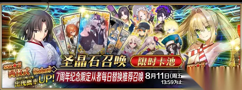 ◆「7周年纪念限定从者每日替换推荐召唤」◆ 时间:2023年8月3日(周四)17:00~8月11日(周五)13:59为止 为了纪念「Fate/Grand Order」7周年,推荐召唤9骑限定从者的7种召唤卡池开放! 此外,除在所有召唤卡池中新登场的「★3(R)方巿」、3种限时概念礼装将被推荐召唤之外,日后将在剧情卡池中追加的2种全新概念礼装也将先行登场! ※以下限定从者只能在作为推荐召唤对象的卡池中进行召唤,敬请注意。 ·★5(SSR)两仪式(Saber) ·★5(SSR)伊莉雅丝菲尔·冯·爱因兹贝伦(Caster) ·★5(SSR)尼禄·克劳狄乌斯(Caster) ·★5(SSR)谜之女主角X ·★5(SSR)宫本武藏(Berserker) ·★5(SSR)阿比盖尔·威廉姆斯〔夏〕 ·★5(SSR)旅行者 ·★4(SR)紫式部(Rider) ·★4(SR)牛若丸(Assassin) ※在本次推荐召唤结束后,以下从者不会加入剧情卡池。 ·★5(SSR)两仪式(Saber) ·★5(SSR)伊莉雅丝菲尔·冯·爱因兹贝伦(Caster) ·★5(SSR)尼禄·克劳狄乌斯(Caster) ·★5(SSR)谜之女主角X ·★5(SSR)宫本武藏(Berserker) ·★5(SSR)阿比盖尔·威廉姆斯〔夏〕 ·★5(SSR)旅行者 ·★4(SR)紫式部(Rider) ·★4(SR)牛若丸(Assassin) ※以下从者将在「7周年纪念 Archetype:Earth 推荐召唤」结束后加入剧情卡池和友情点召唤卡池。 ·★3(R)方巿 ※以下概念礼装的概率没有提升。 ·★5(SSR)炽天之王 ·★4(SR)猎人之梦 ※以下概念礼装将在「7周年纪念 Archetype:Earth 推荐召唤」结束后加入剧情卡池。 ·★5(SSR)炽天之王 ·★4(SR)猎人之梦 ※伴随列表更新,无法在本次召唤中获得以下概念礼装 ·★4(SR)骑士的矜持 ※在「7周年纪念 Archetype:Earth 推荐召唤」结束后,无法在剧情卡池中获得以下概念礼装。 ·★4(SR)骑士的矜持 ※在「7周年纪念 Archetype:Earth 推荐召唤」结束后,仍能在新手引导卡池中获得以下概念礼装。 ·★4(SR)骑士的矜持 ※推荐召唤期间,以下概念礼装也可通过友情点召唤卡池获得。 ·★3(R)重启旅程 ※若在「自动变还设定」中选中★3(R)的概念礼装,那么通过友情点召唤获得的以下概念礼装将被自动变还,敬请注意。 ·★3(R)重启旅程