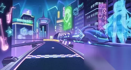 △起点 幻音城假日的起点直道采用开放式包装,路面上挤满了电音城建筑,旁边可以看到穿梭的电音列车。全息肖像、闪烁的霓虹灯、浮动的音符等都是幻音城假日的美景。