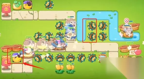 保卫萝卜4白萝卜46 1、开始的时候在左上角一个多重箭,打下面的桌子,第一波兔子出现,左上角增加一个月亮塔,中间增加一个两级多重箭,打下面的竹子。