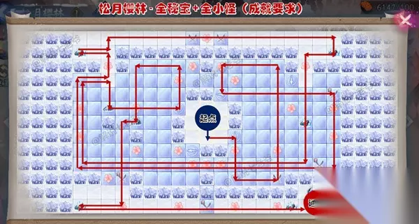 注意事项:路线中未经过小怪千万不要打,直接右上角关闭即可。路线图主要针对较难完成的成就,未涉及到的成就,可以通过重置樱林刷次数完成。 松月樱林成就 1.初次通关 2.拾取所有秘宝通关 3.击败所有怪物通关 4.移动35格内通关 5.完成所有成就